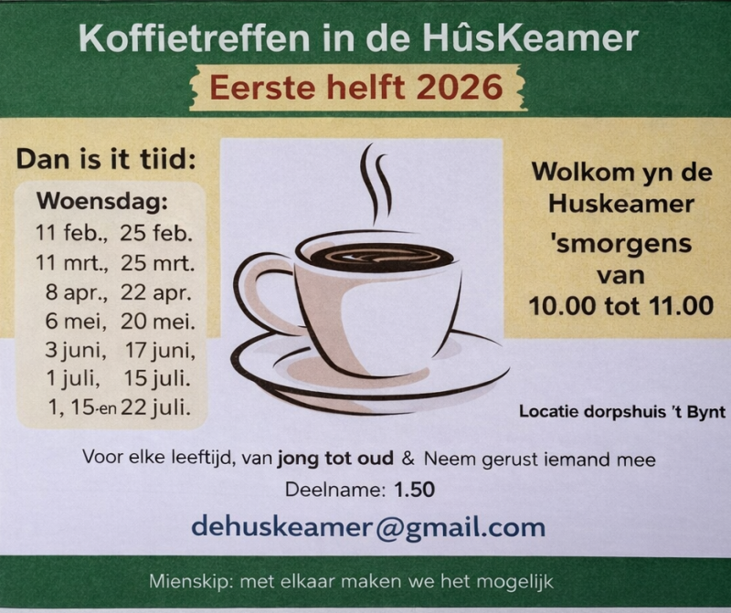 Iedereen is welkom! De hûskeamer vindt plaats op de oneven woensdagen in de maand (eens in de 14 dagen) in het Bynt. Kom gewoon langs en doe mee!